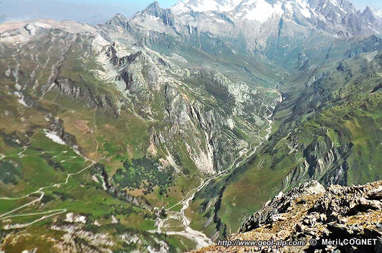 Au total ce matériel valaisan est plaqué en un fort chevron pointant vers le NW à l'assaut du versant (sur les cartes on voit que les couches de ces deux unités dessinent, en franchissant l'arête, un beau chevron* pointant vers le nord-ouest). Le dessin cartographique de ce lambeau tectonique se ferme du côté NE aux abords de Ville-des-Glaciers en se biseautant contre une cassure que suit le lit du torrent et que l'on peut donc apppeler la faille des Chapieux.