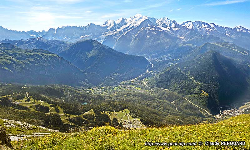 ![]() Le haut vallon de la Diosaz vu du sud-ouest, depuis l'Aiguillette des Houches s.pa = surface de la pénéplaine anté-triasique ; ØS = surface de charriage subalpine "de la nappe de Morcles". ØA = amorce du chevauchement d'Anterne ; ØCh = chevauchement du col des Chaux (il occasionne le redoublement du Jurassique du Buet) (concernant ces deux accidents voir la page "Buet") ; "M" = marbres du Jurassique supérieur . f.Arlevé = faille d'Arlevé (commentaires à la page "Brévent"). |