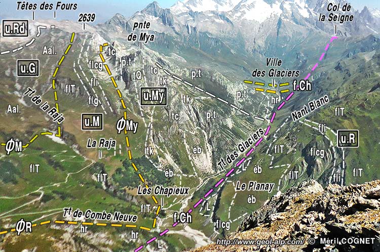 Au total ce matériel valaisan est plaqué en un fort chevron pointant vers le NW à l'assaut du versant (sur les cartes on voit que les couches de ces deux unités dessinent, en franchissant l'arête, un beau chevron* pointant vers le nord-ouest). Le dessin cartographique de ce lambeau tectonique se ferme du côté NE aux abords de Ville-des-Glaciers en se biseautant contre une cassure que suit le lit du torrent et que l'on peut donc apppeler la faille des Chapieux.